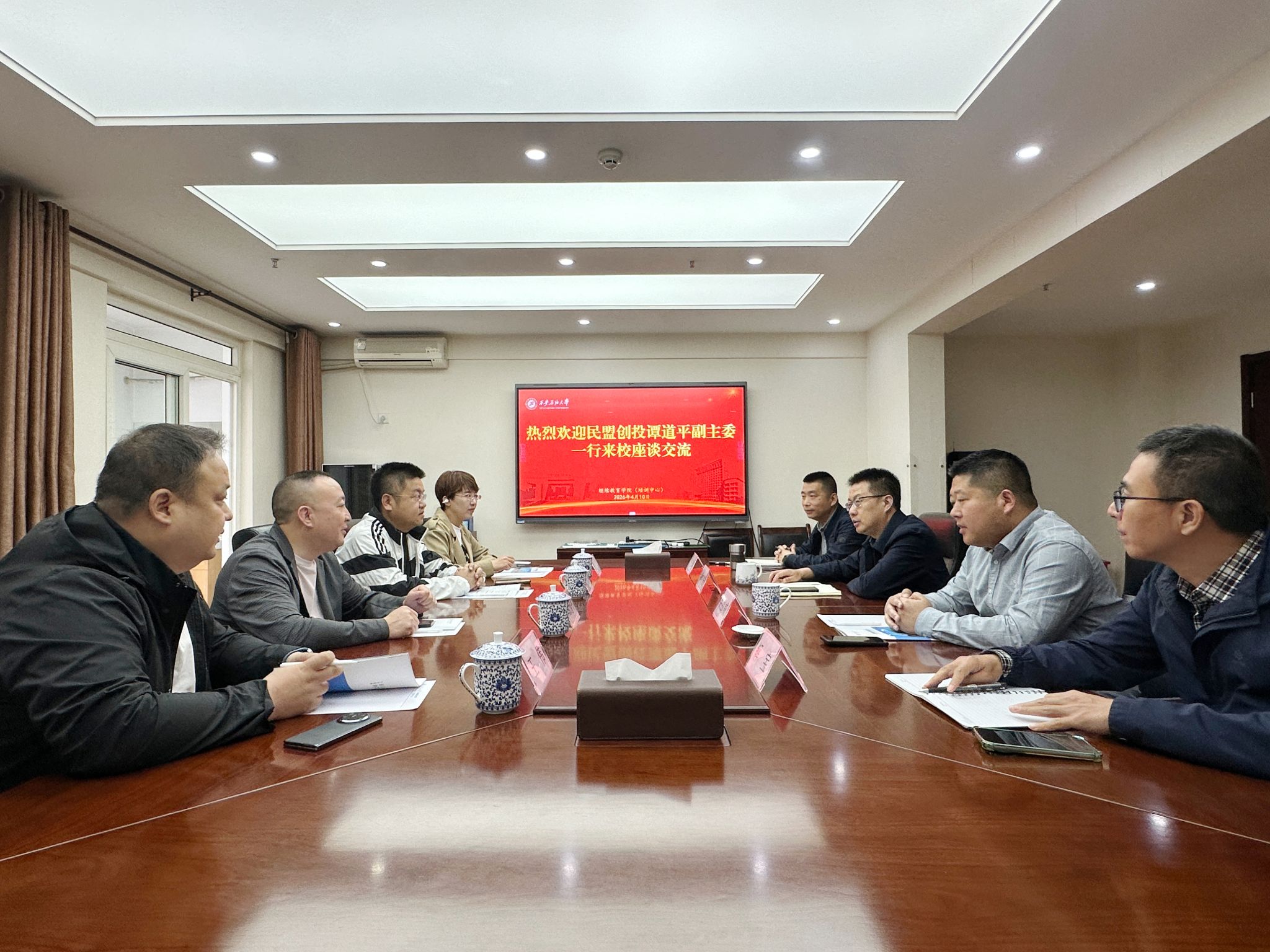 4月10日上午,民盟创投副主委谭道平一行到访beat365官网明德校区,就深化培训项目合作、服务社会等议题进行座谈交流。继续教育学院(培训中心)院长(主任)林红先、校党委统战部办公室主任朱战威及双方相关部门负责人出席会议。