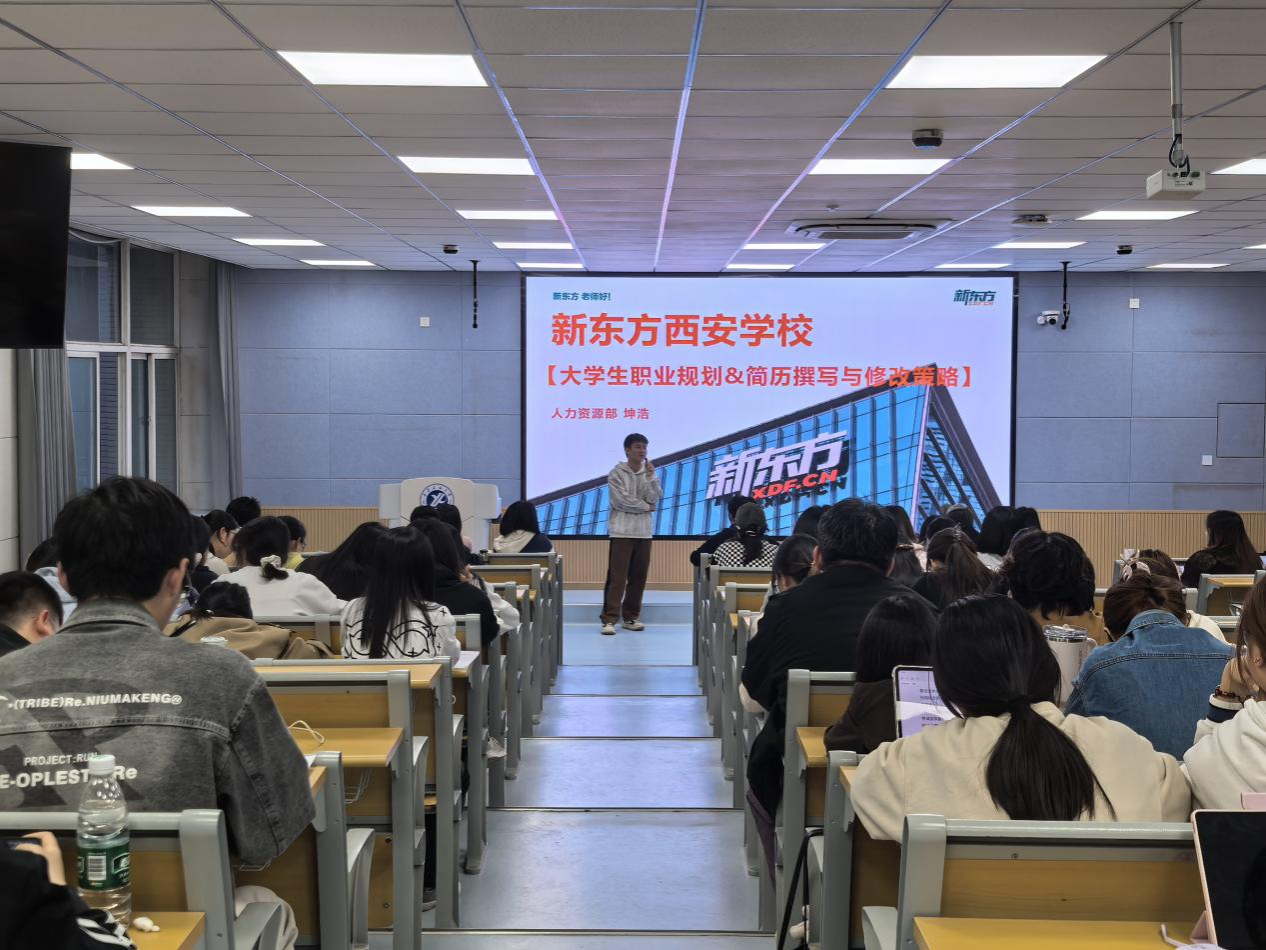 为进一步提升我院学生职业规划意识,夯实求职简历撰写核心技能,助力学子精准把握就业方向、从容应对职场挑战,4月14日,外国语学院在A110教室举办“企业专家进课堂”活动,邀请新东方西安学校校招负责人坤浩老师,以职业规划与简历撰写策略为主题开展讲座,90余名大三、大四学生参加。