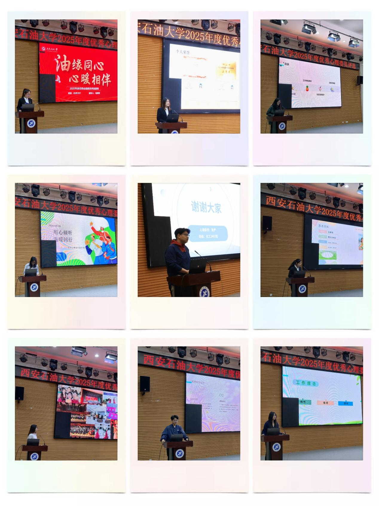 本次评选设置初赛、决赛两个环节,经初赛评选共有 22 名心理委员候选人晋级决赛,最终成绩由初赛视频成绩与现场展示成绩加权构成。汇报现场,参评心理委员从容自信、条理清晰,围绕自我介绍、年度工作特色、心理活动设计三大模块展开汇报,结合班级心理工作,分享工作心得与未来班会规划。在心理班会设计环节,选手们精准聚焦班级学生情绪管理、人际沟通、学业压力、恋爱心理等常见心理困扰,设计打造贴合本班级同学需求、兼具实操性与针对性的活动方案。评委老师们围绕方案落地可行性、团训实施细节、工作经验提炼等方面进行针对性提问。