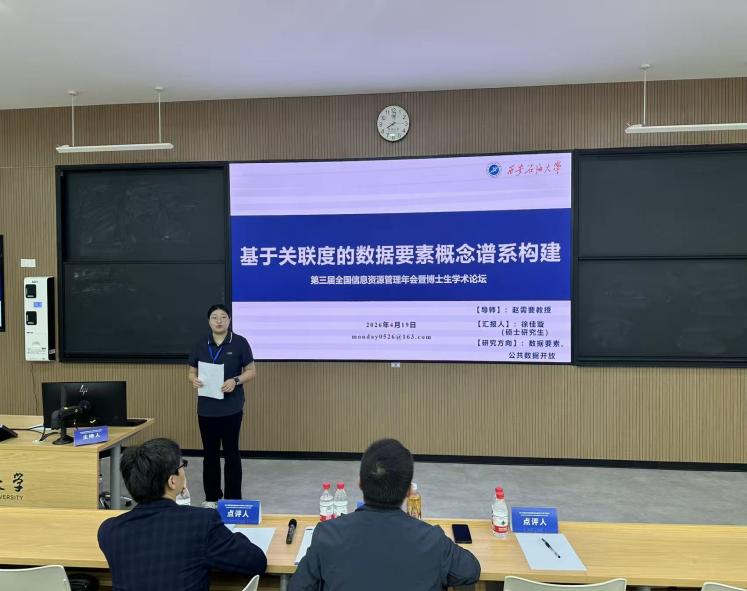 徐佳璇同学在“数据要素治理与价值释放”分论坛作题为《基于关联度的数据要素概念谱系构建》的汇报,获评“第三届IRM年会征文优秀奖”,相关成果被《Knowledge Organization》期刊拟录用;朱峻岐同学在“数智时代公共文化与智慧政务服务”快闪论坛围绕《公共数据开放平台需求牵引能力评价指标体系构建研究》展开分享。此外,张杰妮同学提交的论文《场景驱动下公共开放数据价值化》同样荣获“第三届IRM年会征文优秀奖”。