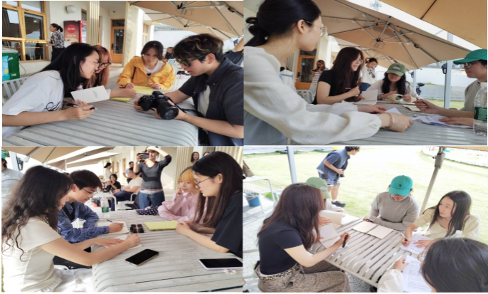 结束终南剧场的采访后,师生一行返回美好生活服务中心。各专业组同学在这里进行了简短的碰头会。大家围坐在一起,拿出手机、笔记本和相机,现场汇总半日来采集的图文与视频素材。新闻组迅速梳理了拍摄的镜头清单,初步确定了英文短片“从土锤咖啡到终南剧场”的叙事主线;国贸组分享了土锤咖啡馆和陶艺店的成本数据,计划围绕“乡村微创业”搭建白皮书框架;中文组展示了在村史馆和8号公路沿线记录的方言词汇与画作信息,准备以“泥土里的关中记忆”为主题撰写手册;会计ACA组则以陶艺店为调研案例,提出可持续性评估的初步方向。短短半小时的交流,各组不仅完成了素材整理,更在跨专业碰撞中激发了新的构思,为后续一周内的成果产出奠定了扎实基础。