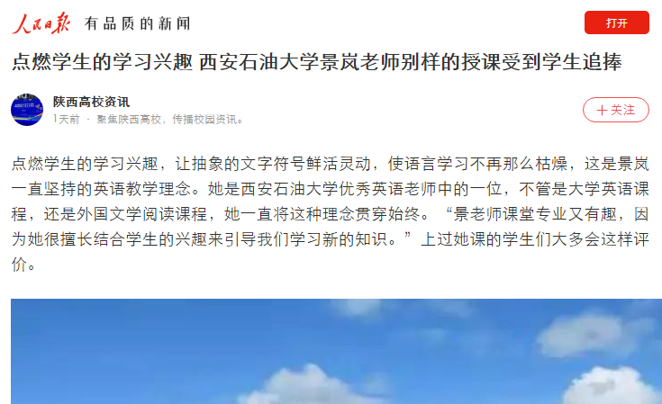 景岚的努力学生们看在眼里记在心里。学生们常常会被她认真的准备和精彩的讲解而感动。她的学生邱冬说:“景老师会耐心带领我们学习课文的背景知识,拓宽我们的知识面。我知道,这一定需要她花费很多时间和精力备课。我要为景老师的认真负责点赞!”