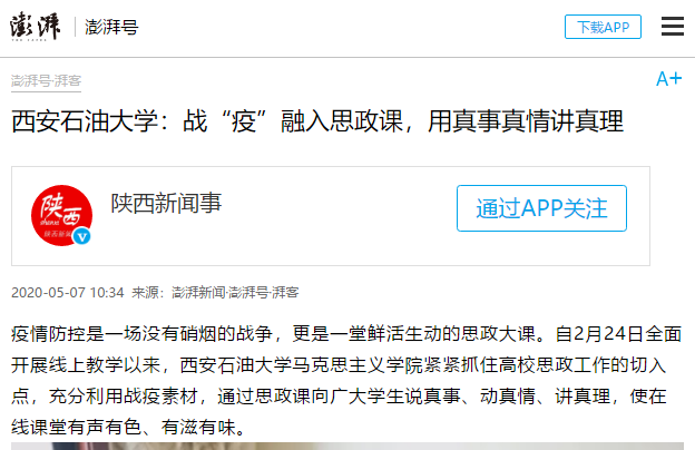 疫情防控是一场没有硝烟的战争,更是一堂鲜活生动的思政大课。自2月24日全面开展线上教学以来,beat365正版唯一官网马克思主义学院紧紧抓住高校思政工作的切入点,充分利用战疫素材,通过思政课向广大学生说真事、动真情、讲真理,使在线课堂有声有色、有滋有味。