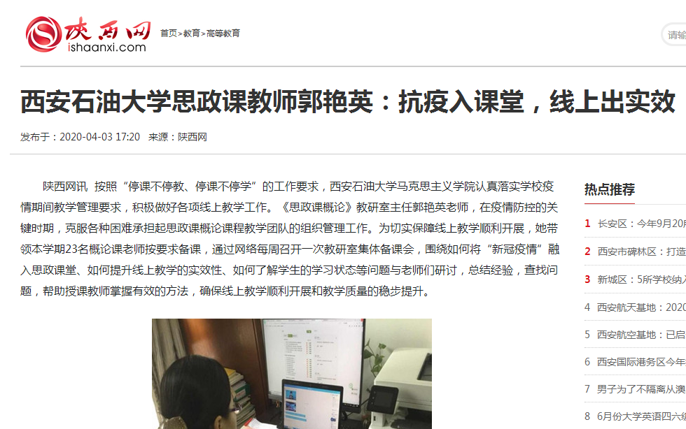 作为一名经验丰富的骨干教师,郭艳英曾经获得2018年陕西省思政课教学能手荣誉称号。疫情当前,她积极探索线上教学的新模式,逐步形成了“课前有规划、课中有督促、课后有反馈”的“三有”教学保障机制。