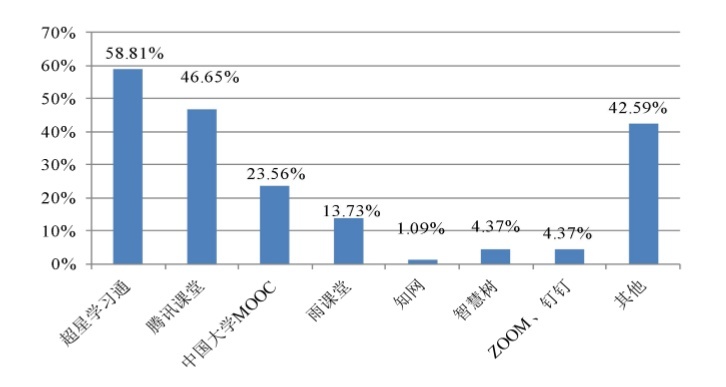 任课教师选用平台情况:任课教师使用超星学习通、腾讯课堂、中国大学MOOC平台的老师最多,多选比例分别为58.81%、46.65%、23.56%。