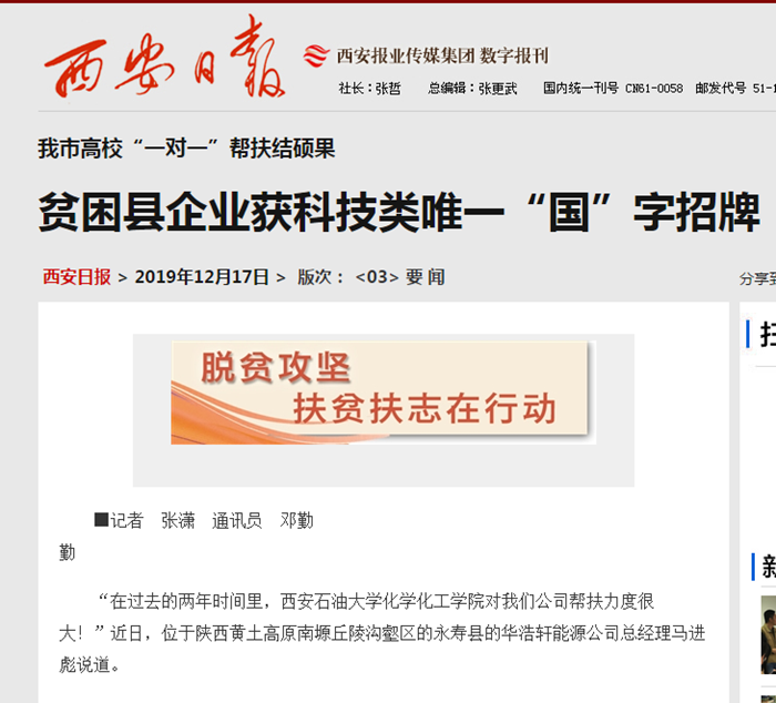 “在过去的两年时间里,beat365正版唯一官网化学化工学院对我们公司帮扶力度很大!”近日,位于陕西黄土高原南塬丘陵沟壑区的永寿县的华浩轩能源公司总经理马进彪说道。