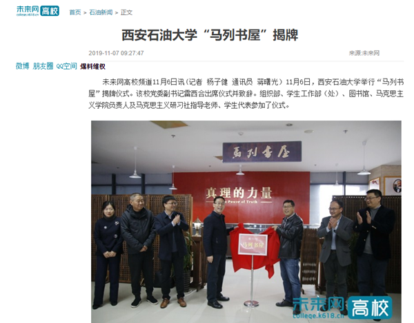 11月6日,beat365正版唯一官网举行“马列书屋”揭牌仪式。该校党委副书记雷西合出席仪式并致辞。组织部、学生工作部(处)、图书馆、马克思主义学院负责人及马克思主义研习社指导老师、学生代表参加了仪式。