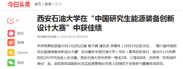 自今年4月启动以来,大赛吸引了国内外151所高校的1075支团队报名参加。该校高度重视参赛筹备工作,年初学校即启动参赛作品遴选、培育工作,组织专家对进入决赛的10支参赛队伍和参赛作品进行了校内答辩和指导,不断完善参赛作品,为竞赛取得优异成绩夯实基础。决赛期间,经过作品展示、专家问答和选手答辩等环节,由万志国、曹银萍两位老师指导,王智勇、关元、冉东、祁珊珊、李羿瑭同学的作品“非周期性耦合水力诱振式连续油管减阻器”和由曹银萍、程嘉瑞两位老师指导,杨伯客、刘银磊、宋振宇、王智勇、杨季同学的作品“高产气井管柱无线传输可控抑振系统”获得绿色高效油气装备类的一等奖。
