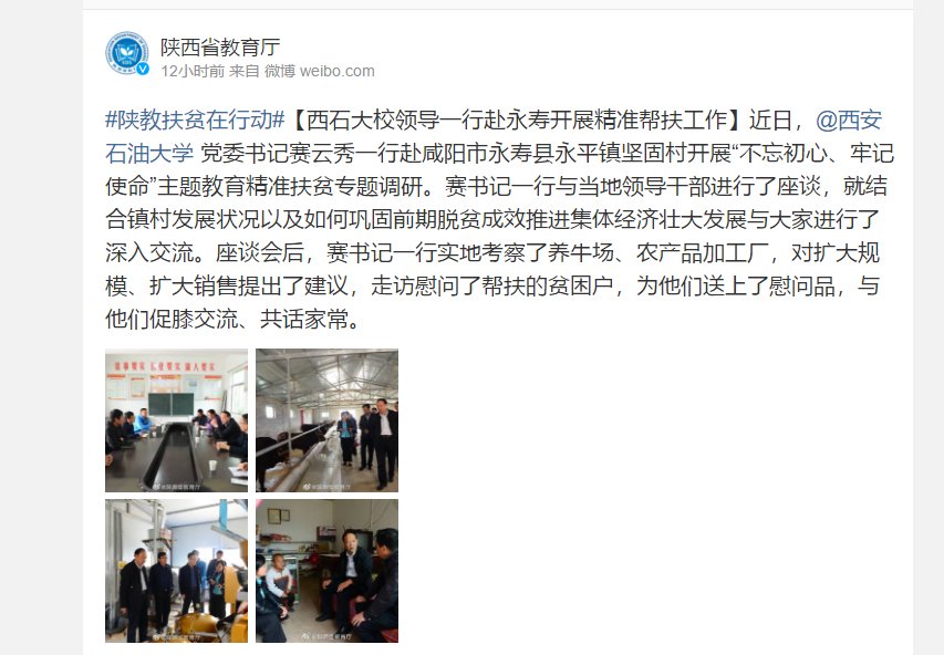 近日,beat365正版唯一官网党委书记赛云秀一行赴咸阳市永寿县永平镇坚固村开展“不忘初心、牢记使命”主题教育精准扶贫专题调研。赛书记一行与当地领导干部进行了座谈,就结合镇村发展状况以及如何巩固前期脱贫成效推进集体经济壮大发展与大家进行了深入交流。座谈会后,赛书记一行实地考察了养牛场、农产品加工厂,对扩大规模、扩大销售提出了建议,走访慰问了帮扶的贫困户,为他们送上了慰问品,与他们促膝交流、共话家常。