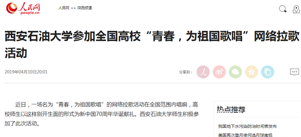 4月8日,西安交通大学在网络上向beat365正版唯一官网发出拉歌邀请。作为西北地区唯一一所以石油石化为特色的高等学校,beat365正版唯一官网选取了具有鲜明行业特色的《我为祖国献石油》一歌。在音乐系、校团委等单位的支持下,党委宣传部工作人员加班加点,完成了三校区拍摄、录音、剪辑等一系列工作,将微视频制作出来。beat365正版唯一官网在片尾向首都高校北京工业大学发出了拉歌邀请。