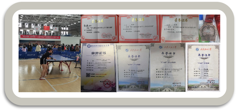 (3)体育竞赛方面:黄凡薇等同学连续两年荣获陕西省乒乓球锦标赛女子团体第五名,黄凡薇和杨成斌等同学分别荣获石油杯乒乓球联赛(女子团体赛和男子团体赛)第二名和第三名,黄凡薇和杨成斌分别荣获阳光体育节女子和男子乒乓单打冠军和亚军。郭志强等同学在校级“石油杯”足球赛和“足协杯”足球赛中均荣获季军。尤婉清等同学荣获女子篮球联赛第三名,张艺茹同学在羽毛球比赛上获得季军。