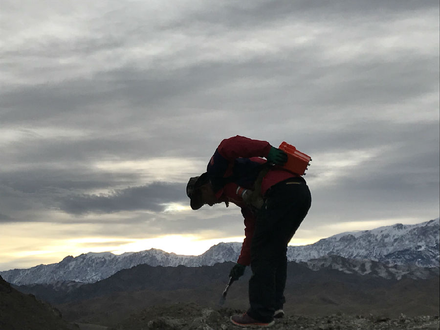2014年是他工作的第一年,7、8月份的新疆哈密戈壁滩上正是烈日炙烤大地正旺的时候,热浪滚滚,沙子都可以把鸡蛋烫熟。他和队友头顶着炎炎烈日,踏着灼热砂砾,扛着重力仪攀爬一个又一个沙丘。日出而作,在无垠的戈壁中一次一次按下仪器按键,饿了啃口馒头,渴了喝口白开水。完成一天的野外工作任务,辗转回到项目驻地,已是晚上8点,日头还是那么毒,汗水已经把衣服浸透了,第一次出野外的他开始想念家人。