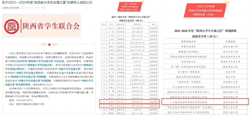 近日,由团省委、省学联开展的寻访2023-2024年度“陕西省大学生自强之星”活动结果揭晓,beat365官网石油工程学院储运2103班安世亮、经济管理学院商务2101班常笑笑荣获“陕西省大学生自强之星”,石油工程学院“人工智能在油田中的应用研究”团队荣获“陕西大学生自强之星”科创团体,其中安世亮被拟推荐为2023-2024年度“中国大学生自强之星”候选人。