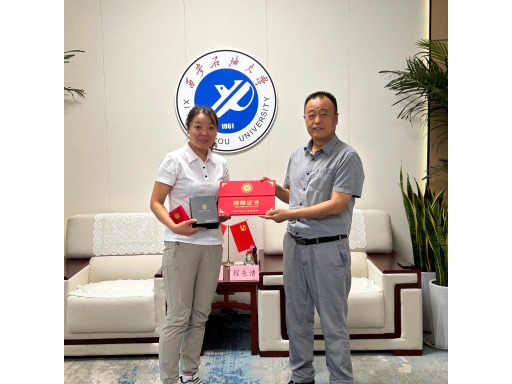 程永清为何静颁发捐赠证书、校友徽章及“一滴油”纪念品。