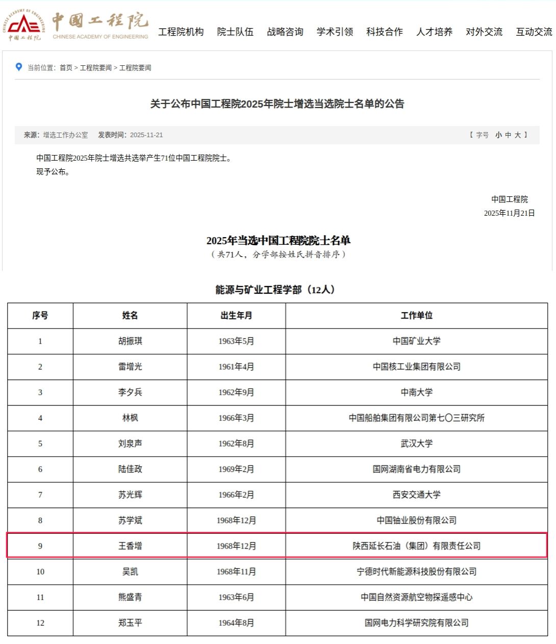 11月21日,中国工程院2025年院士增选结果正式揭晓,共选举产生71位中国工程院院士,其中,能源与矿业工程学部新增院士12人,beat365官网85级校友、碳中和未来技术研究院院长王香增当选。