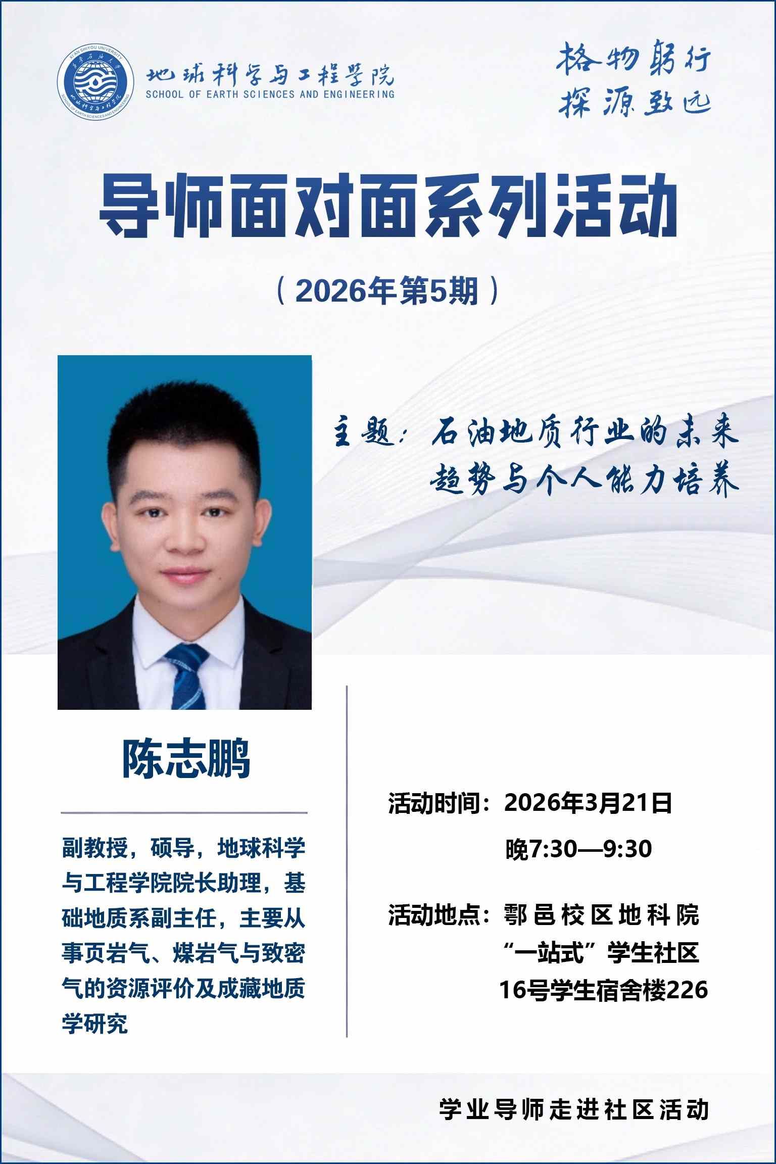 报告地点:鄠邑校区地科院“一站式”学生社区16号学宿舍楼226